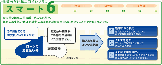 ●上記支払い例には、諸費用・税金(消費税除く)・オプションなどは含まれておりません。表示価格は、東京地区車両本体価格です。リサイクル料金は別途必要です。●地域・販売店により、販売していない車種、また据置価格設定が異なる場合があります。●想定走行距離や使用方法によっては据置価格の設定が異なる場合がございます。●ワンナップシステムでは、3年後の車両査定で、据置価格を上回った場合には、お客様に差額をお返しいたします。ただし車両状態や走行距離によっては、据置価格との差額をご負担いただく場合があります。●3年後は、「買取」「乗り換え」「売却」のうちご自由な選択が可能です。●月々のお支払いの100円以下の端数は、初回に加算されます。●支払い対象額にのみ、4.8%の実質年率が適用されます。(実質年利はプラン、信販会社により異なります) ●ワンナップ価格とは、車両本体価格から据置価格分を差し引いた金額に、消費税(車両本体価格にかかる分)を加えたものになります。●掲載車両の写真とグレードは異なる場合があります。●車両写真はイメージです。